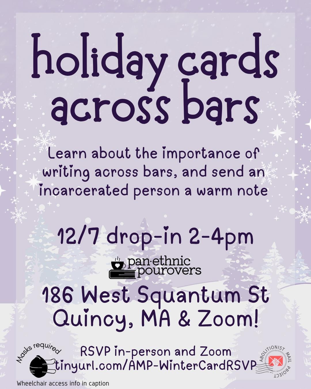- "Learn about the importance of writing across bars, and send an incarcerated person a warm note... Incarceration is lonely any time of year, but the winter holidays can be especially rough. Join us to write cards to incarcerated people, sending warm vibes through the bars this winter. We're hoping some incarcerated folks with join us by phone.