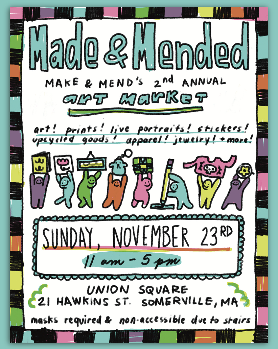 "Mark your calendars! Our second annual MADE & MENDED art market is coming on Sunday, November 23rd! Featuring arts, prints, portraits, stickers, upcycled goods, apparel, jewelry and more from our wonderful Make & Mend staff members."